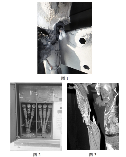 2009年2月15日,回南天,仙村站孔堂線在經歷了長達18分鐘的間歇性接地后速斷跳閘,重合不成功,K5013-0003X電纜分支箱601開關B相進線電纜終端應力錐處首要短路燒毀(如圖2)。據分支箱鄰近商鋪店主反映,箱內曾持續宣布嘩啪的響聲并冒煙,畢竟傳出爆炸聲音。經開端剖析,事端原發點為B相應力錐尾部,由于密封不嚴,硅脂固化,在工作環境濕度較大的情況下出現凝露,水氣進入纜芯,導致絕緣強度損壞發生爬電。畢竟由間歇性接地發展到三相短路(如圖3)。此次故障相同導致分支箱氣室破損走漏,分支箱作廢。