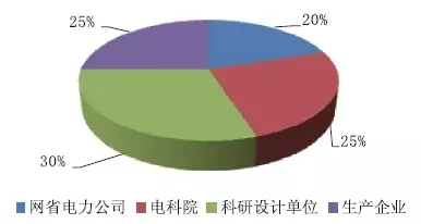 本著為電力工作翻開效能的繩尺,本次查詢網省電力公司占比20%,電科院占比25%,科研規劃單位占比30%,消費企業占比25%。如圖所示。