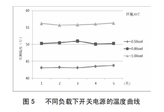 改善后,為考證改善作用,對(duì)開關(guān)電源分別在0.5倍、0.8倍及1.0倍負(fù)載下間斷了為期5天的帶負(fù)荷實(shí)驗(yàn),圖5為不同負(fù)載下開關(guān)電源的溫度曲線,由圖5可知,跟著負(fù)荷的增大,開關(guān)電源問(wèn)題整體呈上升趨向;負(fù)載不變的情況下,同一溫度曲線根柢堅(jiān)持滑潤(rùn);開關(guān)電源在額定負(fù)載下作業(yè),最高溫度不超越57℃,未達(dá)報(bào)警值,開關(guān)電源穩(wěn)定性得到明顯前進(jìn)。
